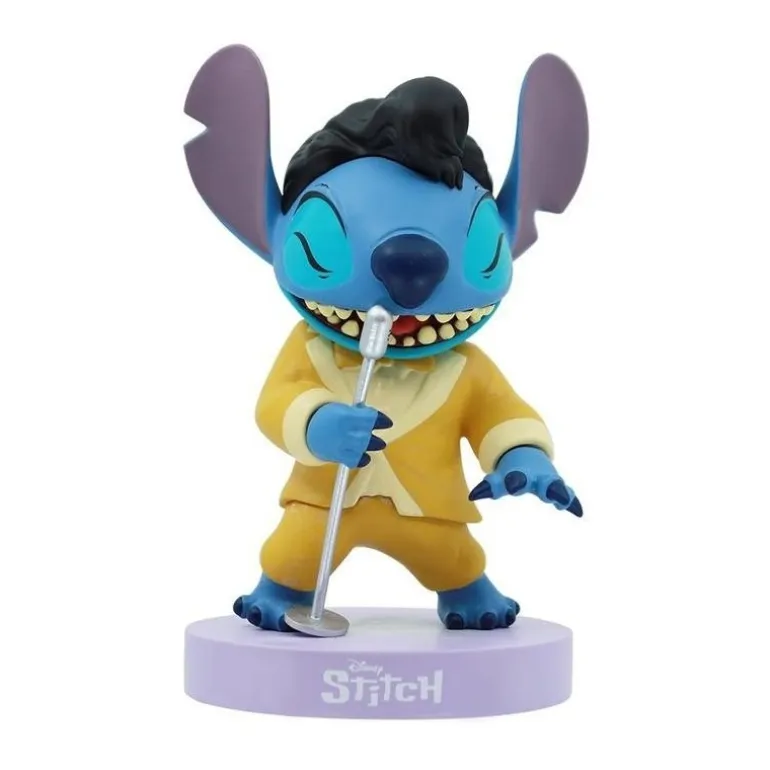 Diviértete con la figura de Stitch vestido de Elvis presentada por Enesco. Esta figura captura al travieso alienígena de Disney en una pose dinámica, vistiendo un icónico traje amarillo de Elvis mientras sostiene un micrófono plateado, lista para hacer su actuación. Hecha con materiales de alta calidad, esta figura oficial es el regalo perfecto para los fans de Disney y de Stitch.