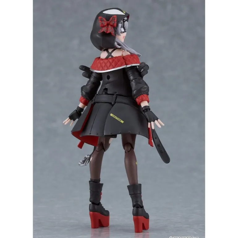 El diseño presenta una combinación de colores negro, rojo y blanco, con detalles que resaltan su atuendo característico, como la falda a cuadros y el abrigo con capucha. Sus botas de plataforma y guantes completan un look moderno y audaz. Cada pieza está cuidadosamente esculpida para ofrecer un acabado impecable.