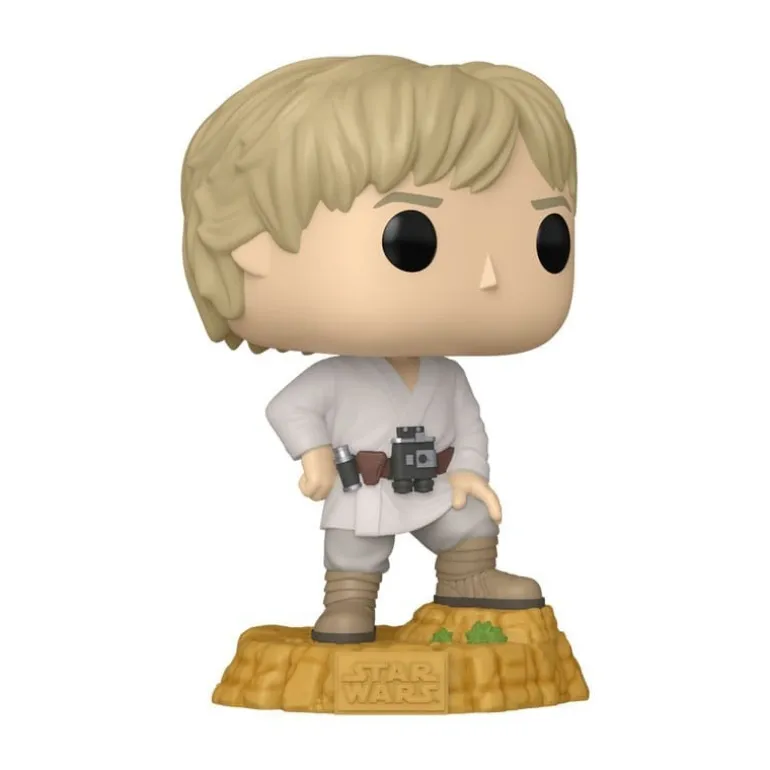 El diseño muestra a Luke Skywalker con su icónico traje blanco, botas beige y cinturón marrón, sobre una base con detalles de terreno desértico y el logo de Star Wars. Su característica cabeza grande y ojos oscuros le otorgan un toque único que encantará a todos los que adoran esta saga épica.