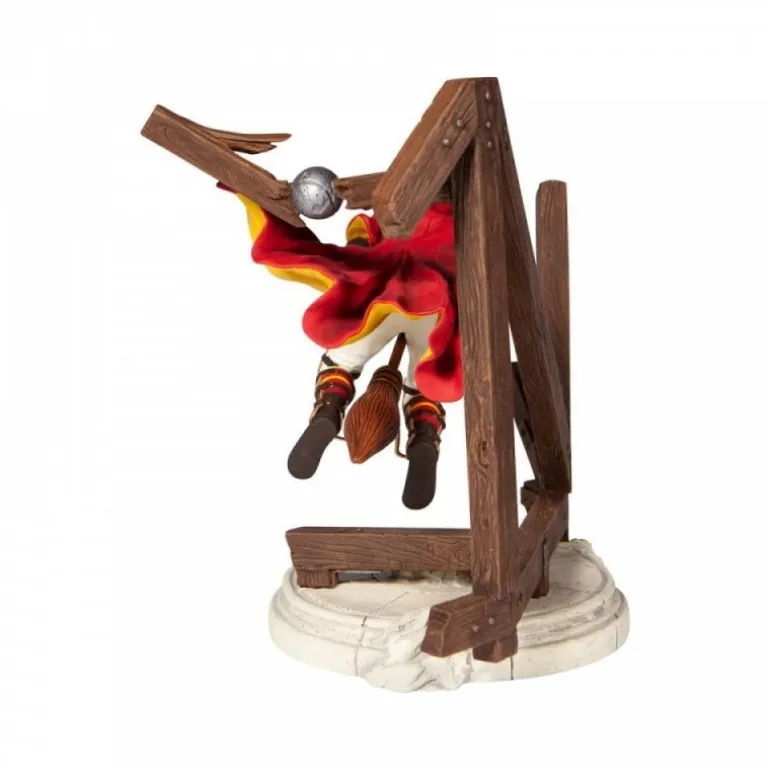 Esta figura coleccionable de Enesco captura a Harry Potter en su emocionante vuelo durante un partido de Quidditch. Vestido con la característica túnica roja y amarilla de Gryffindor, Harry está montado en su escoba con una expresión decidida. La base simula un entorno de juego, destacando detalles en madera que realzan la ambientación mágica del deporte.