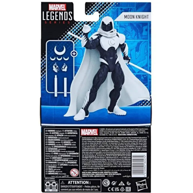 La figura representa a Moon Knight, también conocido como Caballero Luna, con su icónica vestimenta blanca y negra, capturando la esencia del mercenario Marc Spector que resucitó para convertirse en el avatar del dios de la Luna, Khonshu. Incluye accesorios intercambiables como un bastón y manos adicionales para poses dinámicas.