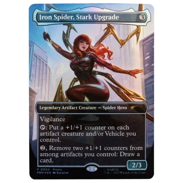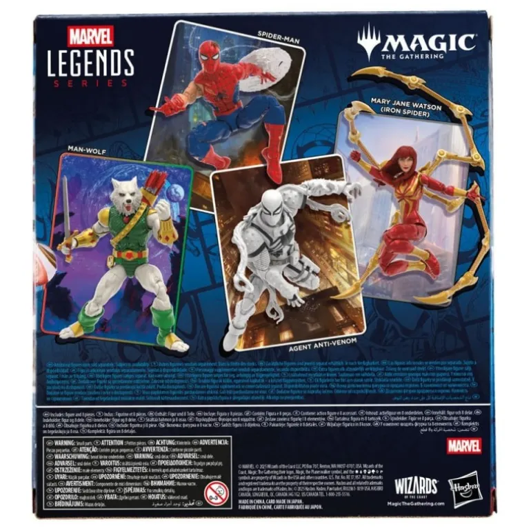 Vestida con el icónico traje rojo y dorado de Iron Spider, Mary Jane viene acompañada por siete accesorios, incluyendo una cabeza alternativa con máscara, pares de manos intercambiables que lanzan telarañas, y las características patas doradas del traje. Además, se incluye una exclusiva carta metalizada de Magic: The Gathering, perfecta para coleccionistas y aficionados al juego.