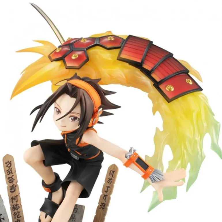 La figura presenta a Yoh en una pose dinámica, sosteniendo un halo energético dorado sobre su cabeza, con detalles de rojo y negro, que simulan un movimiento enérgico. El terreno en el que se encuentra, compuesto por piedras y vegetación, añade un toque de realismo y ambientación al conjunto.