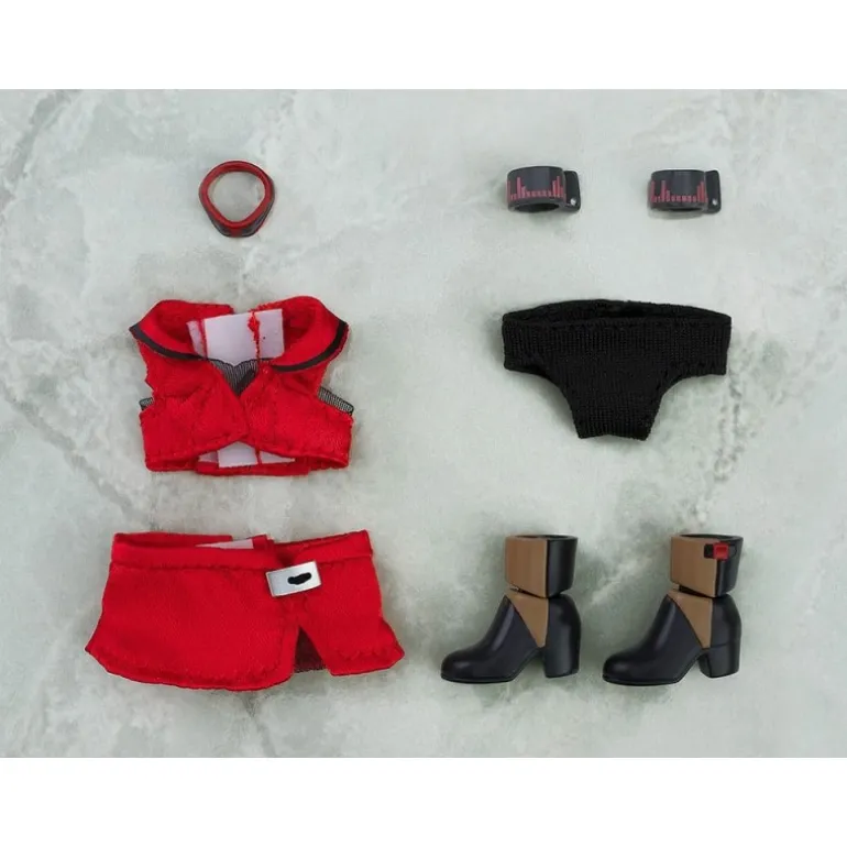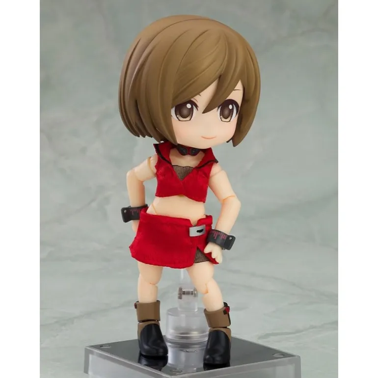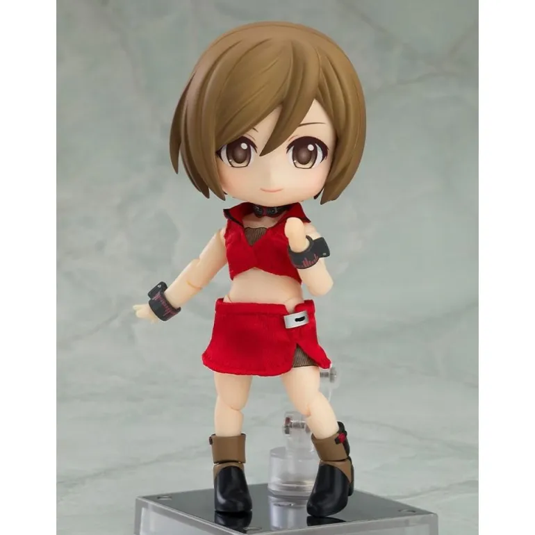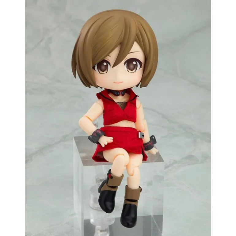 La figura presenta un atuendo rojo vibrante, compuesto por un top corto y falda, destacando su estilo único. Los detalles incluyen botas marrones con negro, y accesorios que complementan su personalidad. Puedes colocarla en diversas poses gracias a sus articulaciones, haciendo de este artículo un complemento perfecto para cualquier fan de Vocaloid.