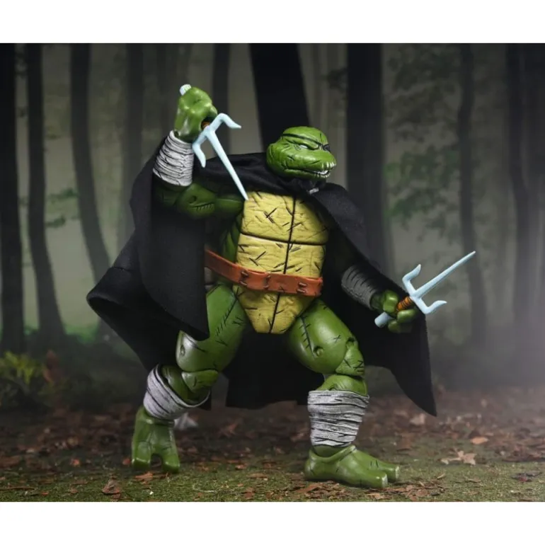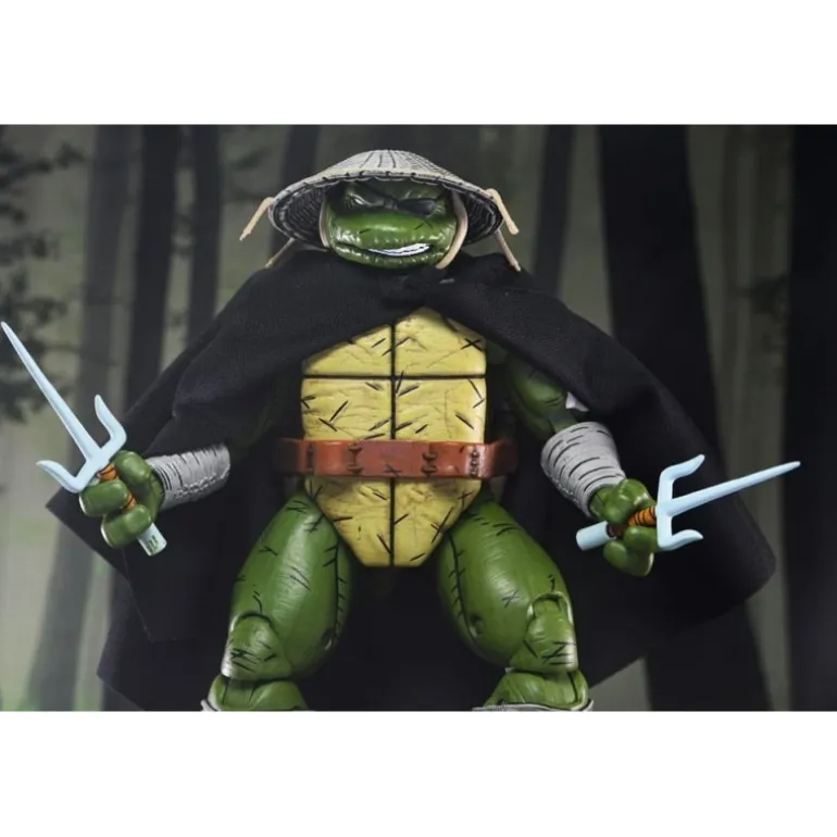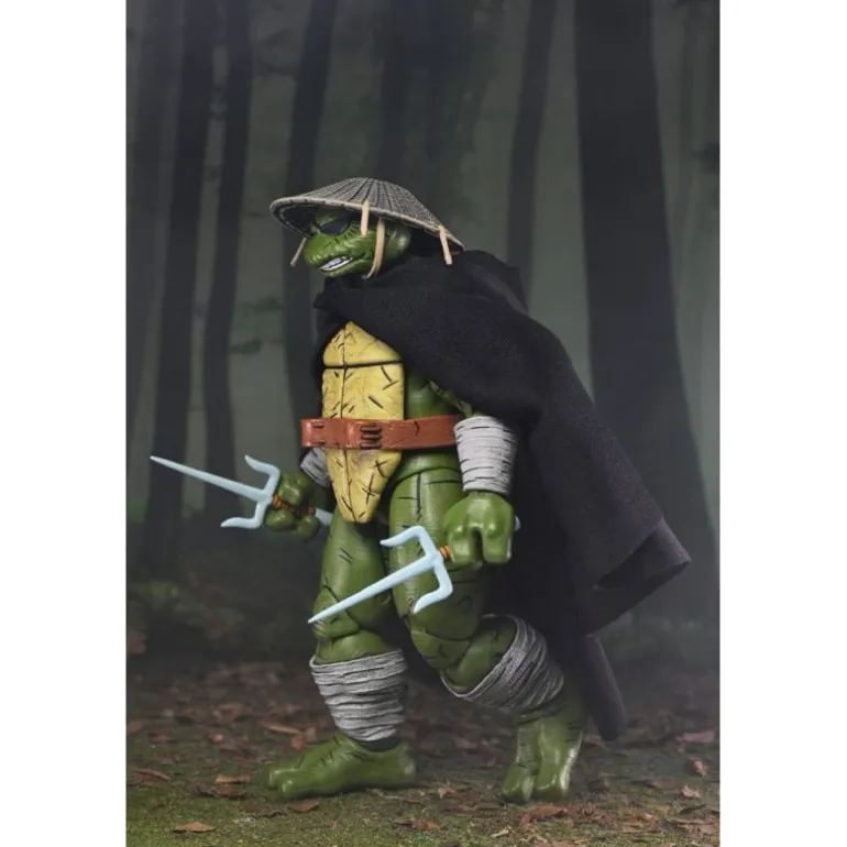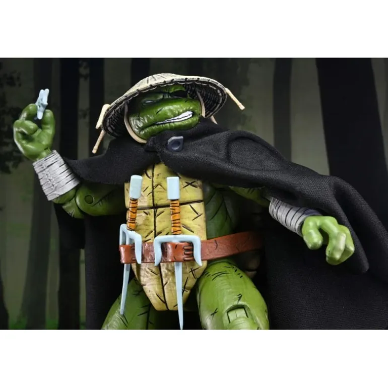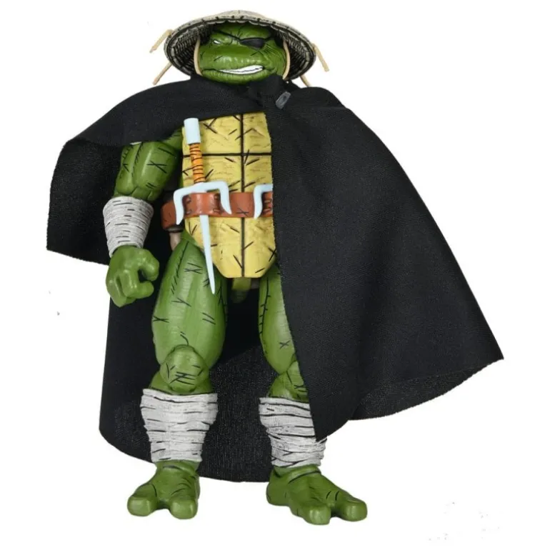 Old Man Raphael se presenta con un aspecto veterano y experimentado, luciendo una capa negra que agrega un aire de misterio. Su característico caparazón y la icónica máscara acentúan su identidad inconfundible como una de las famosas tortugas ninja. La figura incluye múltiples accesorios: armas ninja, manos intercambiables y objetos de combate que enriquecen su versatilidad.