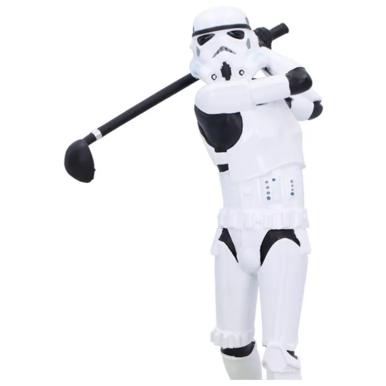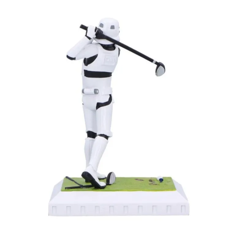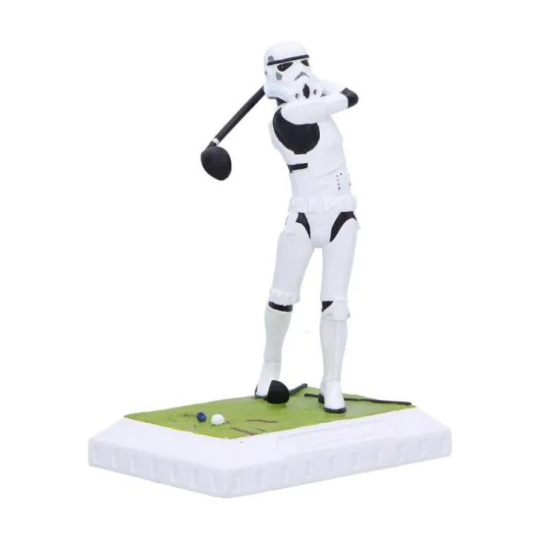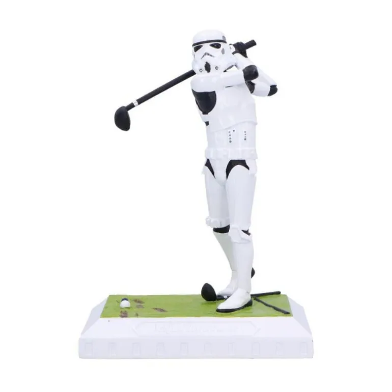 El Stormtrooper se muestra en un divertido swing, sosteniendo un palo de golf mientras se prepara para un golpe magistral. La base simula un campo de golf, añadiendo un toque de humor y originalidad al diseño.