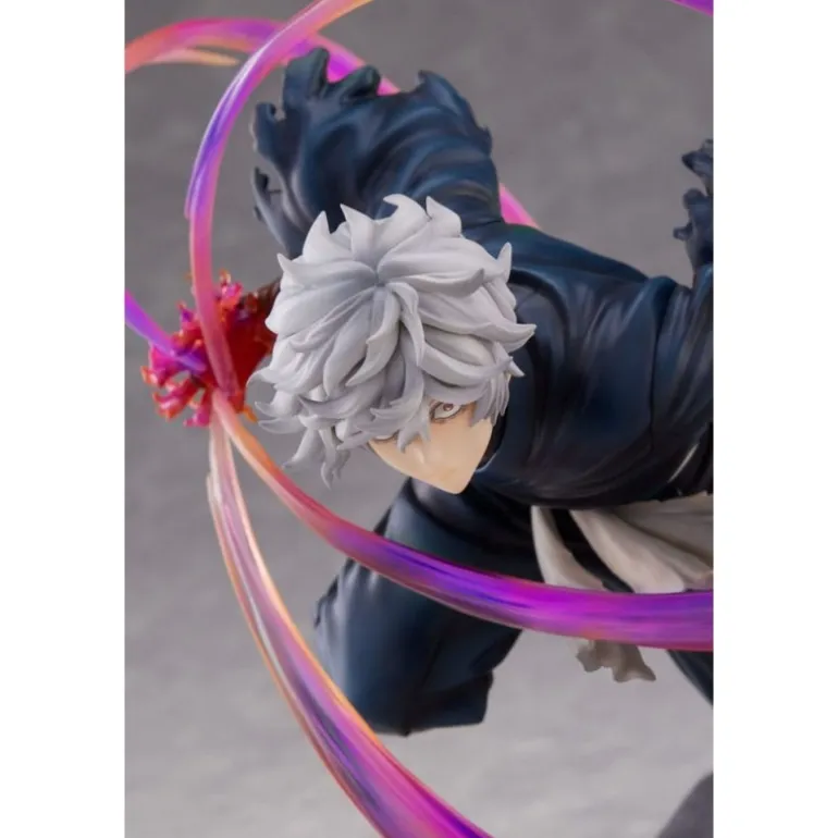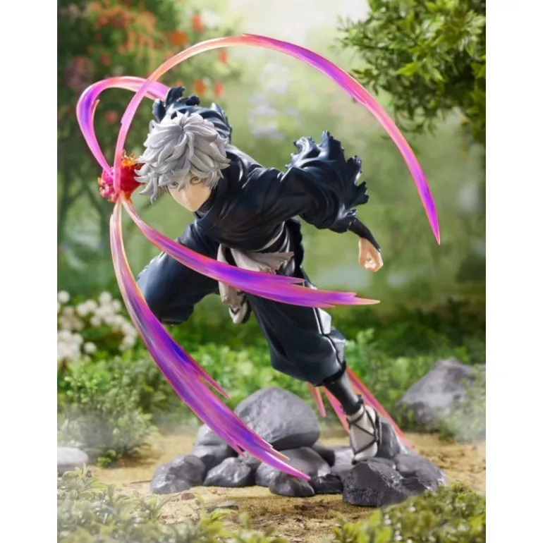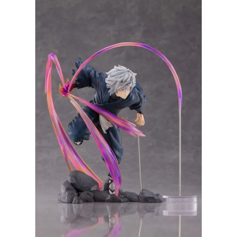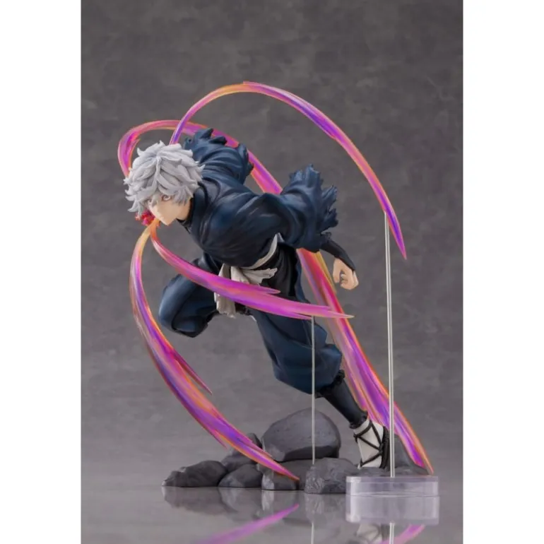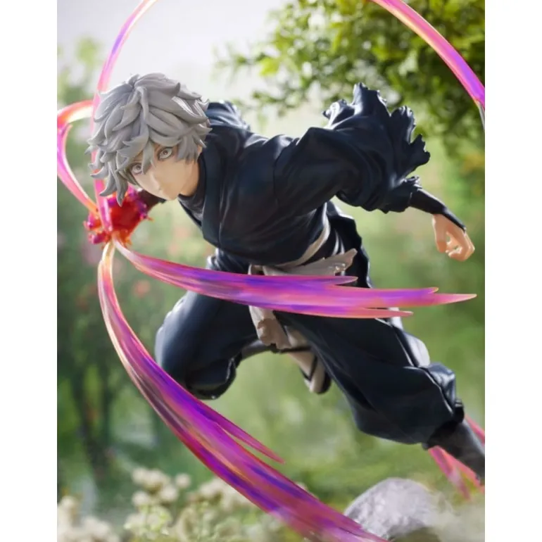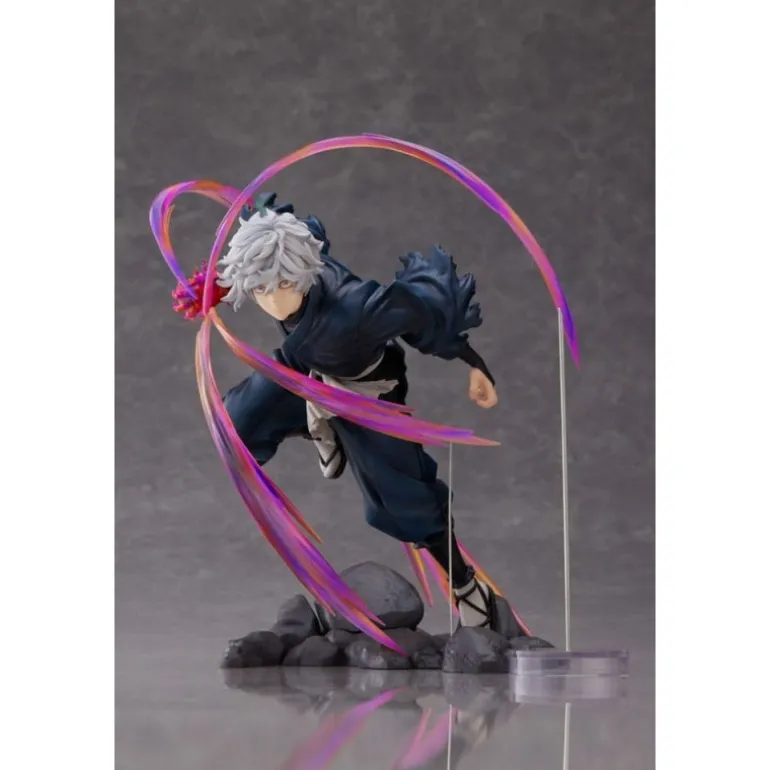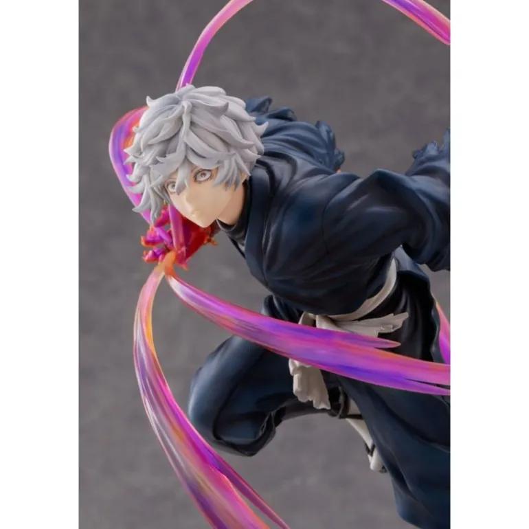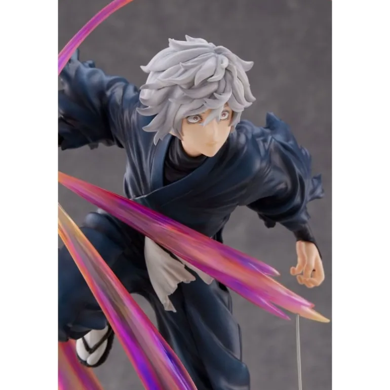 La figura, de aproximadamente 20 cm, muestra a Gabimaru en una posición de acción, rodeado de espectaculares efectos que simulan movimiento con tonalidades que varían desde el púrpura hasta el rosa. Estos efectos, junto con la textura detallada del traje oscuro de Gabimaru y su cabello grisáceo, crean un contraste visual impactante.