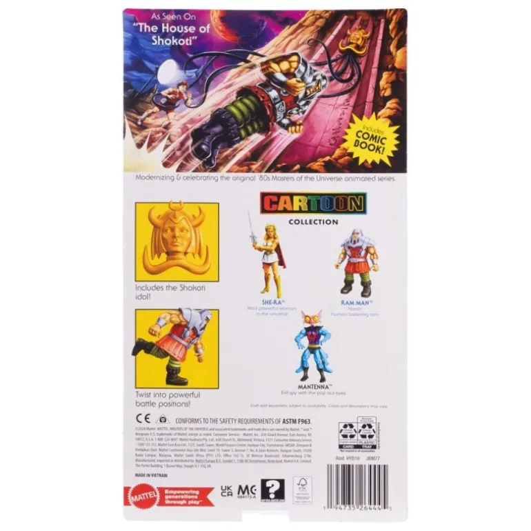 Incluye un accesorio adicional: un ídolo dorado de Shokoti, que añade un valor histórico a la pieza, haciendo referencia a la rica narrativa de la serie. El embalaje presenta un diseño llamativo con ilustraciones vibrantes que narran fragmentos del universo de He-Man, lo que convierte a este producto en una pieza tanto para jugar como para exhibir.