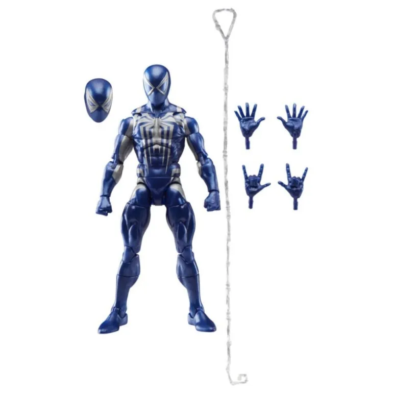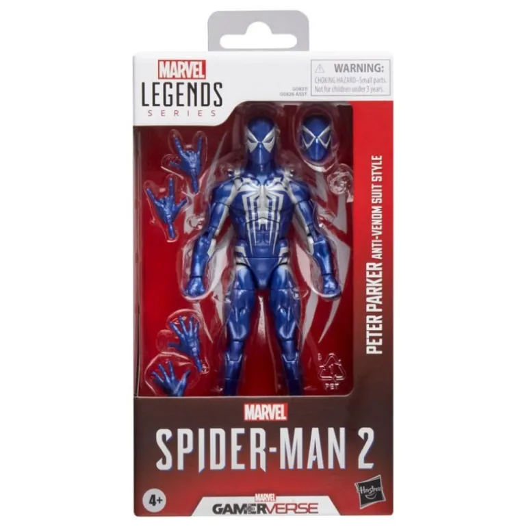El traje Anti-Venom viene en un llamativo color azul con detalles en blanco, replicando fielmente el estilo del traje en el videojuego. La figura incluye 6 accesorios, entre ellos, un par de manos alternativas para lanzar telarañas y una telaraña para representar escenas emocionantes.