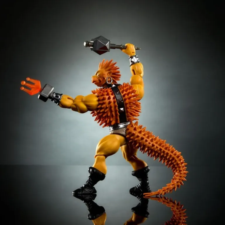 Descubre la figura articulada Spikor de la serie Masters of the Universe Origins. Este personaje, del fabricante Mattel, está diseñado con gran detalle, destacando su armadura con púas de color anaranjado y un impresionante martillo como accesorio. La figura mide aproximadamente 14 cm de altura y captura fielmente la esencia del clásico villano del universo MOTU.