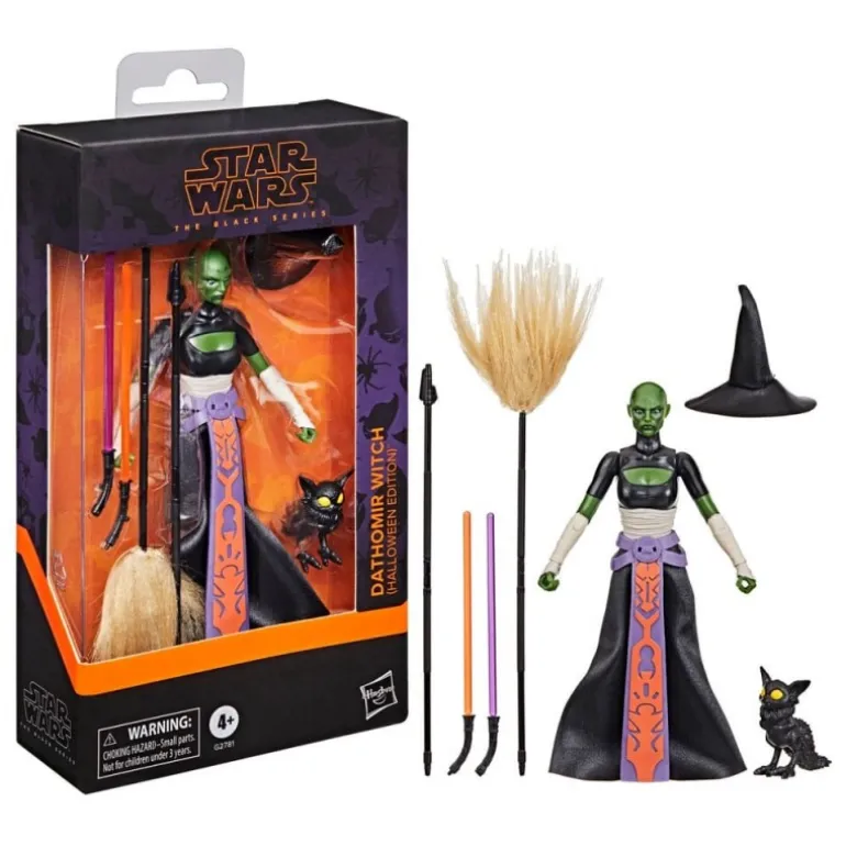 Descubre la magia de la galaxia con la figura Dathomir Witch Halloween Edition de la icónica línea Star Wars The Black Series. Esta figura de 15 cm captura con detalle a la hechicera de Dathomir, con un impactante diseño especial para Halloween. La figura presenta una piel verde y un atuendo negro con detalles en morado y naranja, complementado con un sombrero de bruja y un cinturón detallado.