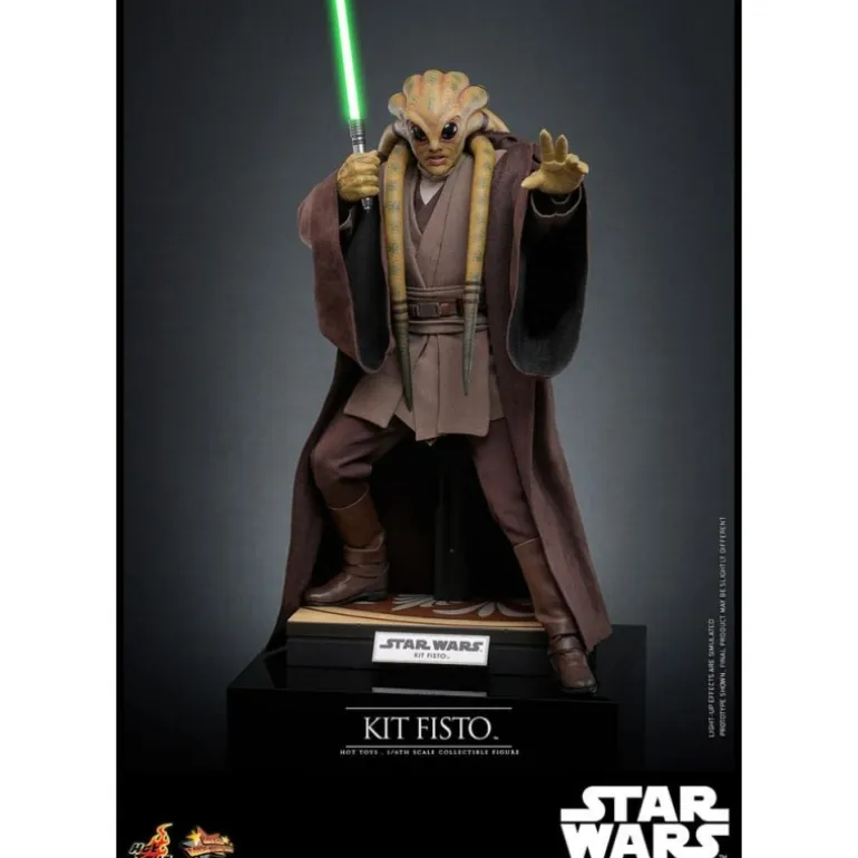 Descubre la impresionante figura articulada de Kit Fisto, un imprescindible para los coleccionistas de Star Wars. Con aproximadamente 32 cm de altura, esta figura de Hot Toys está diseñada a una escala 1/6, capturando cada detalle del carismático maestro Jedi. Su atuendo, meticulosamente elaborado, incluye una túnica marrón y botas de cuero, recreando fielmente el look del personaje.