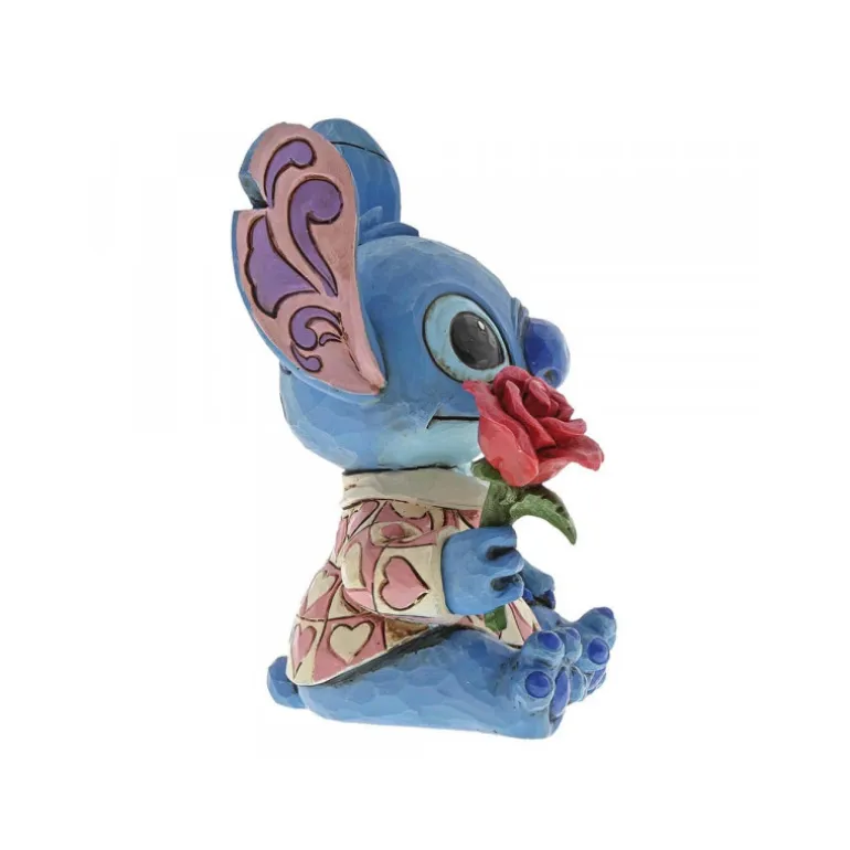En esta ocasión, tenemos a un personaje divertido y adorable a partes iguales: el gran Stitch de Lilo y Stitch , con sus 15 cm y todos sus detallitos característicos reproducidos minuciosamente, además de los propios de Jim Shore. Es una edición especial San Valentín, así que aparece con una rosa en la mano, lo que lo hace todavía más amoroso de lo que ya es Stitch en sí.