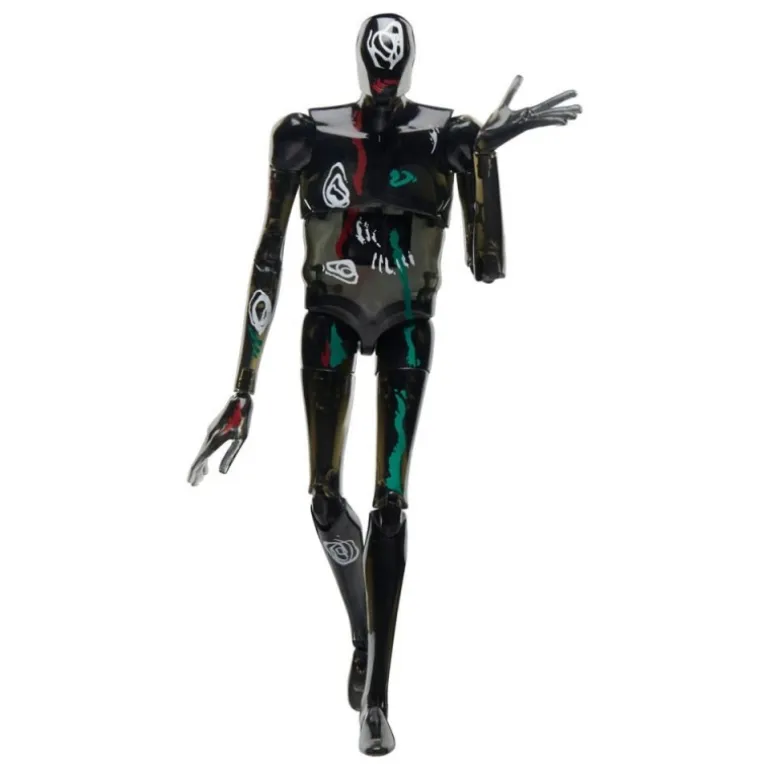 La figura de The Spot destaca por su acabado en color negro brillante, decorado con manchas blancas y detalles en verde y rojo que capturan perfectamente su apariencia singular y misteriosa. Cada articulación en cabeza, brazos y piernas permite poses dinámicas y creativas.