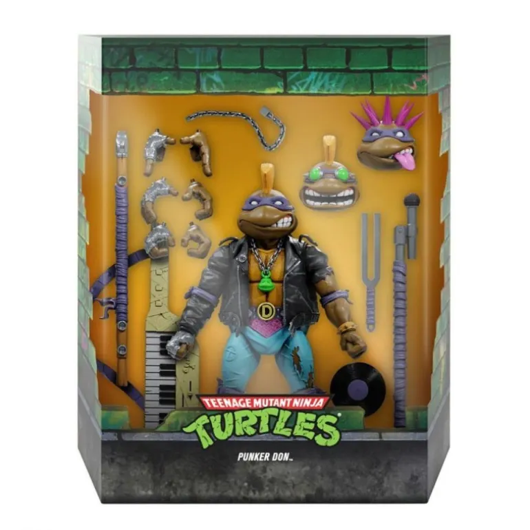 Descubre la figura de colección de Donatello versión Punker de la famosa serie Tortugas Ninja. Esta figura articulada de 18 cm, fabricada por Super7, es una impresionante representación con un estilo único y detallado.