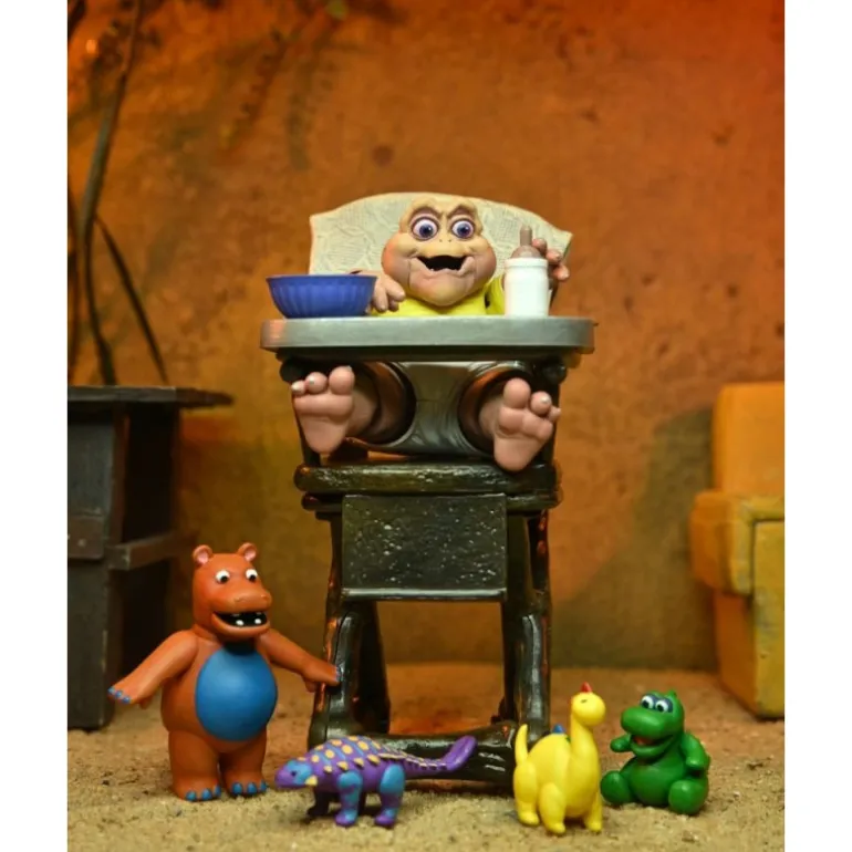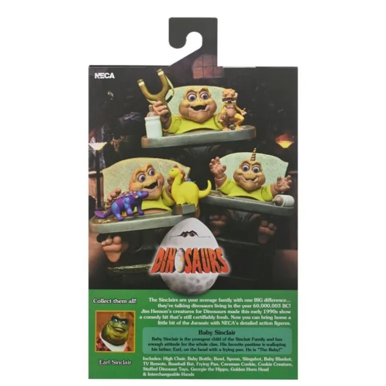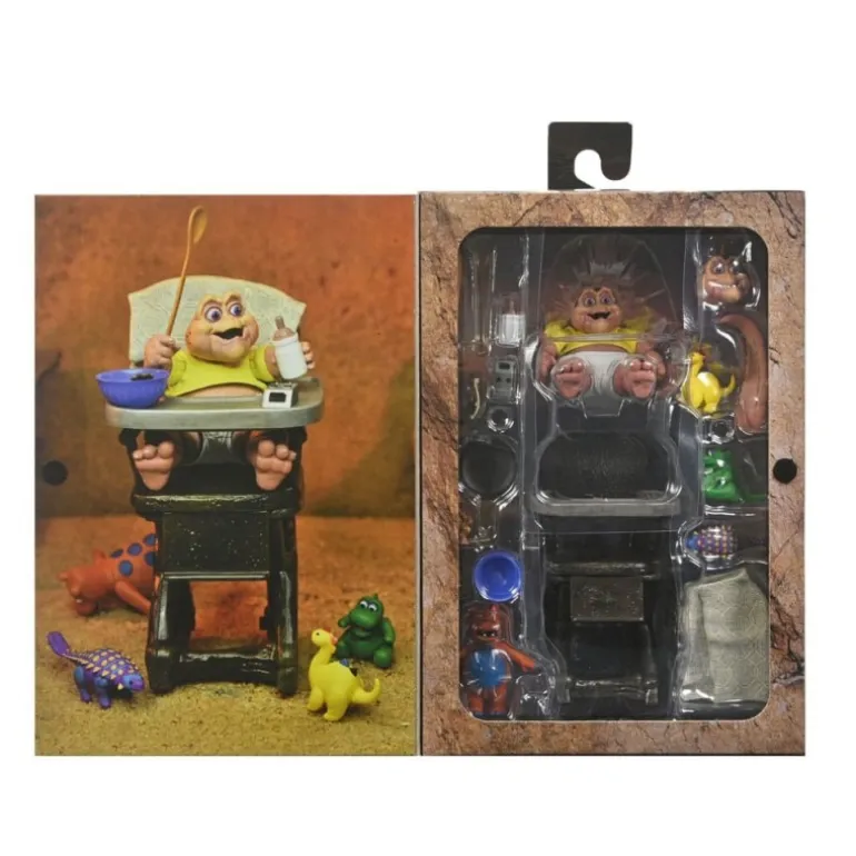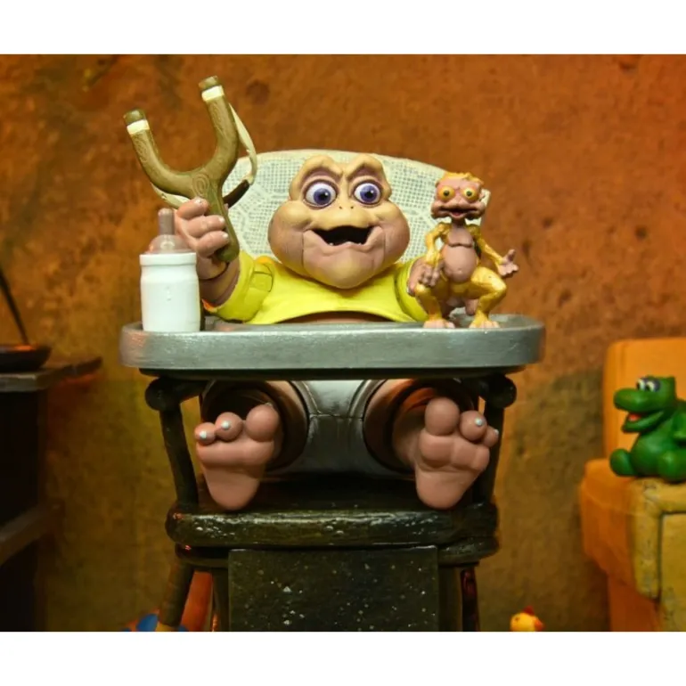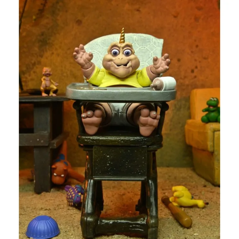 La **figura Ultimate Baby Sinclair** de la icónica serie de televisión «Dinosaurs» es una pieza imprescindible para los coleccionistas. Esta figura de 18 cm, fabricada por **Neca**, captura con gran detalle al entrañable Baby Sinclair, sentado en su característico sillón alto.