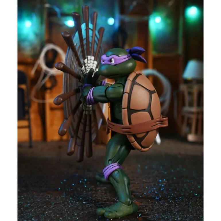 Descubre la increíble Figura Ultimate Donatello de las Tortugas Ninja, un homenaje a los clásicos de animación que captura la esencia de este icónico personaje. Esta figura, de aproximadamente 18 cm, muestra a Donatello en un dinámico color verde, con su característico antifaz morado y detalles precisos en su caparazón marrón. La figura está completamente articulada, permitiendo recrear tus escenas favoritas del show.