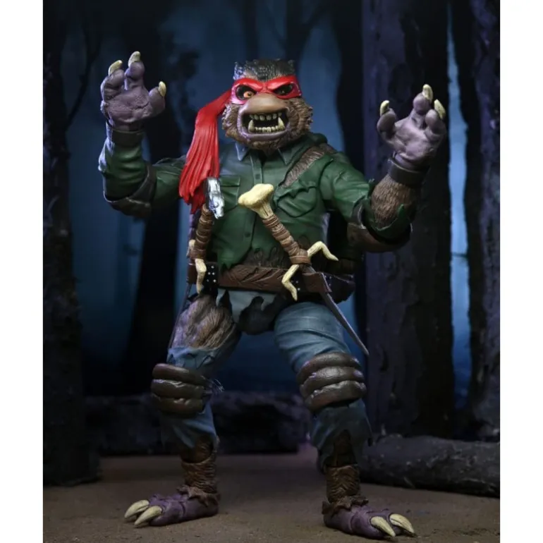 La figura presenta un detalle increíble: desde su piel cubierta de pelo y su furioso rostro de lobo, hasta su icónica máscara roja de Raphael. Lleva una camisa verde rasgada, un cinturón marrón, y pantalones azules desgastados, reflejando una transformación en medio de un bosque oscuro.