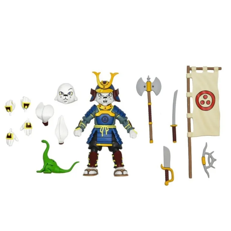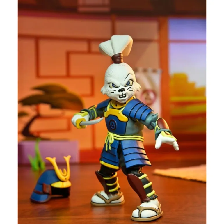 La figura destaca por su detallada armadura samurái en tonos azul y amarillo, combinada con detalles en marrón y un emblema distintivo en el pecho. Su expresiva cara refleja la audacia y valentía de Usagi Yojimbo, mientras que su arsenal de armas asegura que esté siempre listo para la acción.