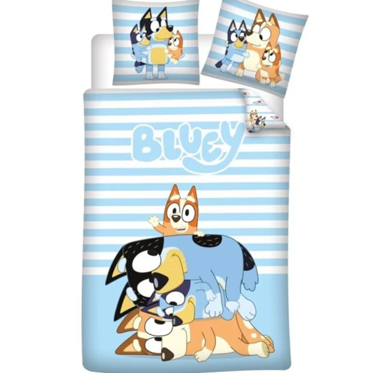 Transforma el dormitorio de tus pequeños con esta encantadora funda nórdica de algodón, inspirada en el querido personaje de Bluey. Presenta un colorido diseño con rayas horizontales en tonos azules y blancos, acompañado de una ilustración divertida de los personajes de Bluey. La funda incluye una imagen central de la familia de Bluey, añadiendo un toque acogedor y alegre a la habitación de los niños.