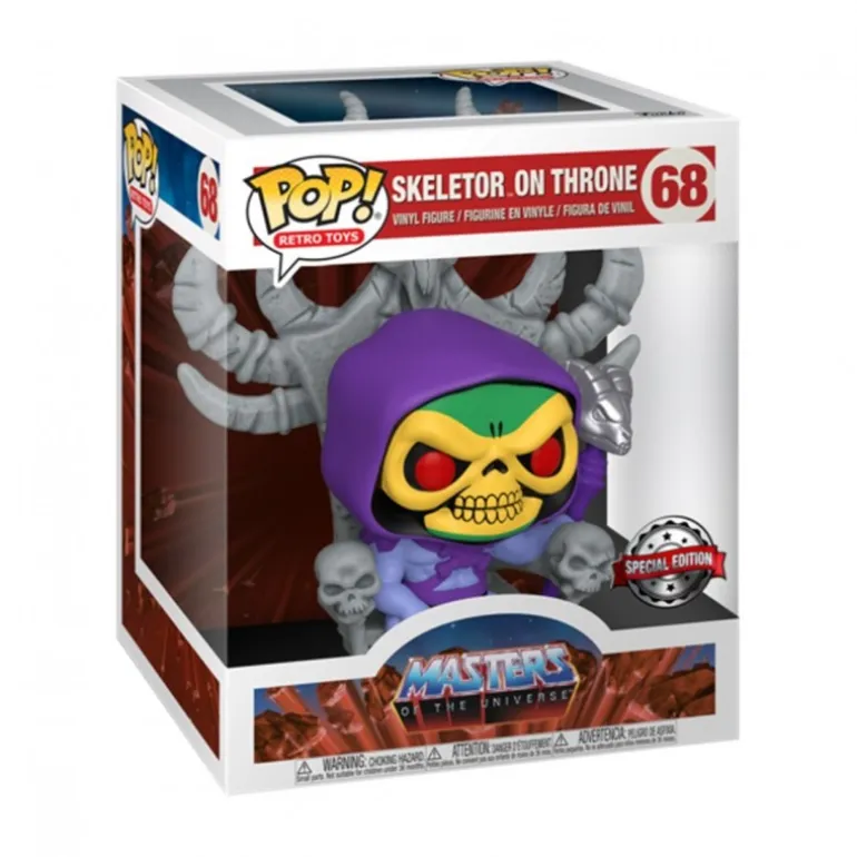 Amplía tu colección de Funko Pop con esta impresionante figura deluxe de Skeletor de la serie de animación Maestros del Universo. Fabricada en vinilo, esta figura mide 20 centímetros de altura, ideal para destacarse en cualquier estantería. La figura representa a Skeletor sentado en un trono decorado con calaveras y cuernos, lo que resalta aún más su carácter intimidante.