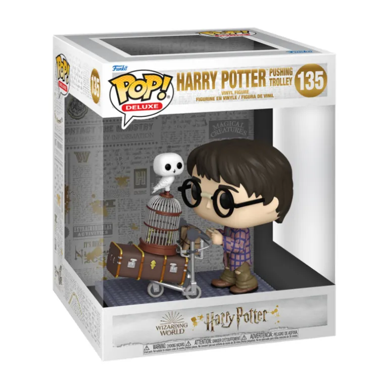 Y en esta ocasión Funko dentro de su serie Pop Deluxe nos trae nada menos que a Harry Potter empujando el carrito en el andén 9 y 3/4 que le llevaría en su primer año a Hogwarts en el Expreso de Hogwarts. Se pueden ver un montón de detalles como las maletas, la ropa que llevaba ese día y a Hedwig.