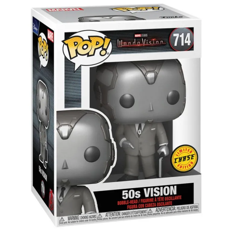 En esta ocasión Funko nos trae una serie de figuras dedicadas a la exitosa serie de Marvel Studios, WandaVision (también conocida como Bruja Escarlata y Visión). En este caso tenemos a Vision como civil, en su versión de la década de los 50, en blanco y negro y con ese aspecto de la época tan característico. Pero además, este Funko Pop! tiene un chase, una versión alternativa y exclusiva que puede que te toque de forma completamente aleatoria, y que nos muestra a Visión con su aspecto más conocido de héroe. ¡Prueba suerte y puede que te toque cualquiera de la dos versiones!