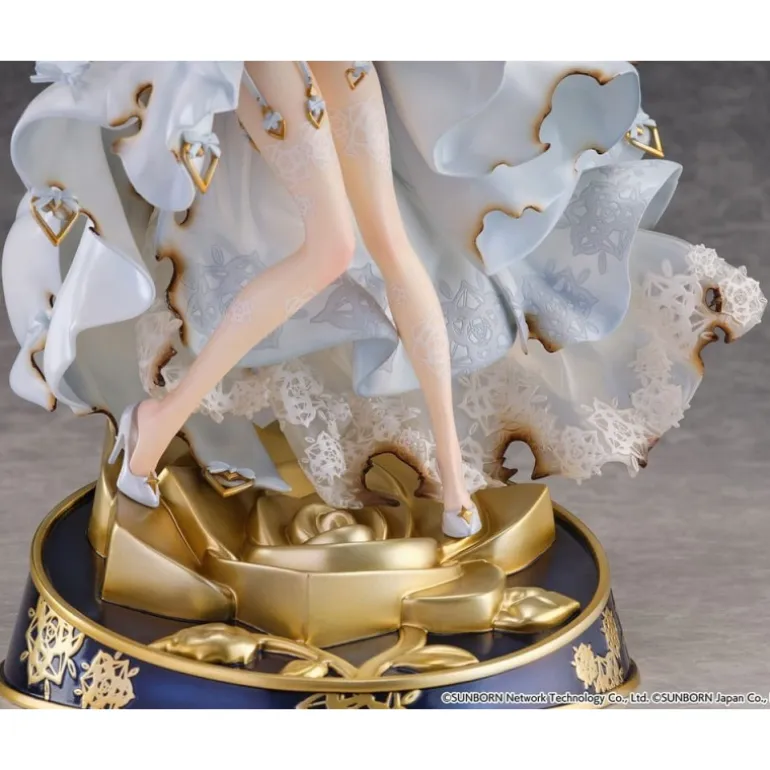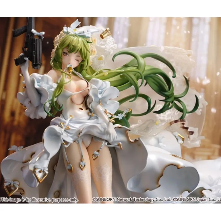 Con unas dimensiones aproximadas de 29 cm de altura, la estatua captura la esencia del personaje con su elegante vestido blanco decorado con detalles dorados y encajes, junto con su largo cabello verde que fluye de manera realista. Cada elemento, desde las texturas del vestido hasta la postura dinámica, refleja la calidad y el cuidado en el diseño.
