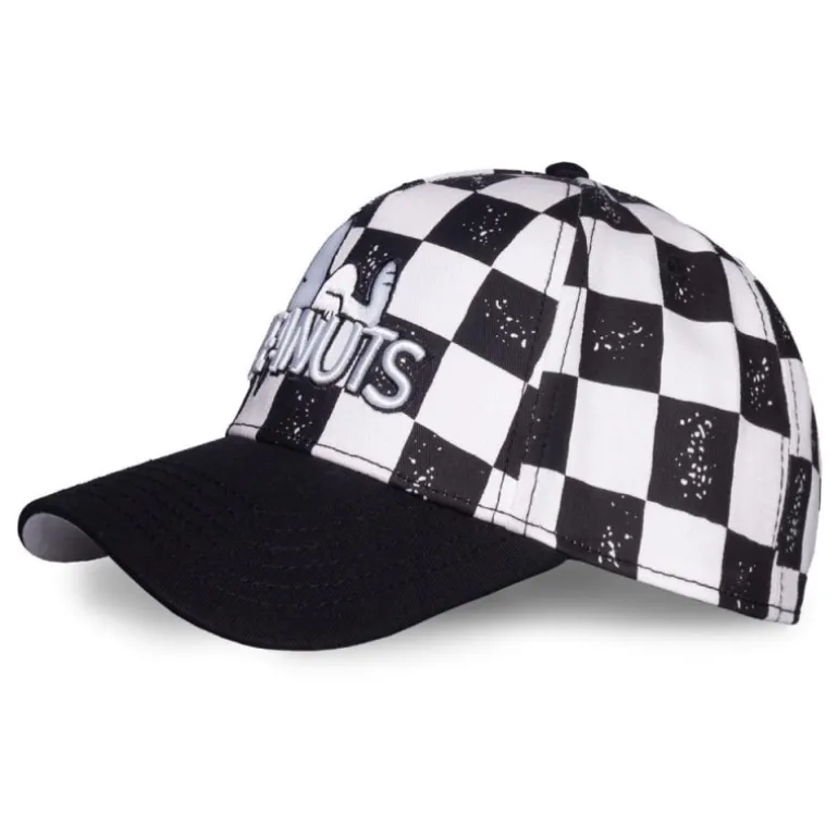 Su diseño distintivo presenta un patrón de tablero de ajedrez en blanco y negro, incorporando el logotipo de Peanuts con el icónico Snoopy, haciendo de esta gorra un complemento lleno de personalidad. El cierre ajustable en la parte trasera asegura un ajuste perfecto para cualquier tamaño.