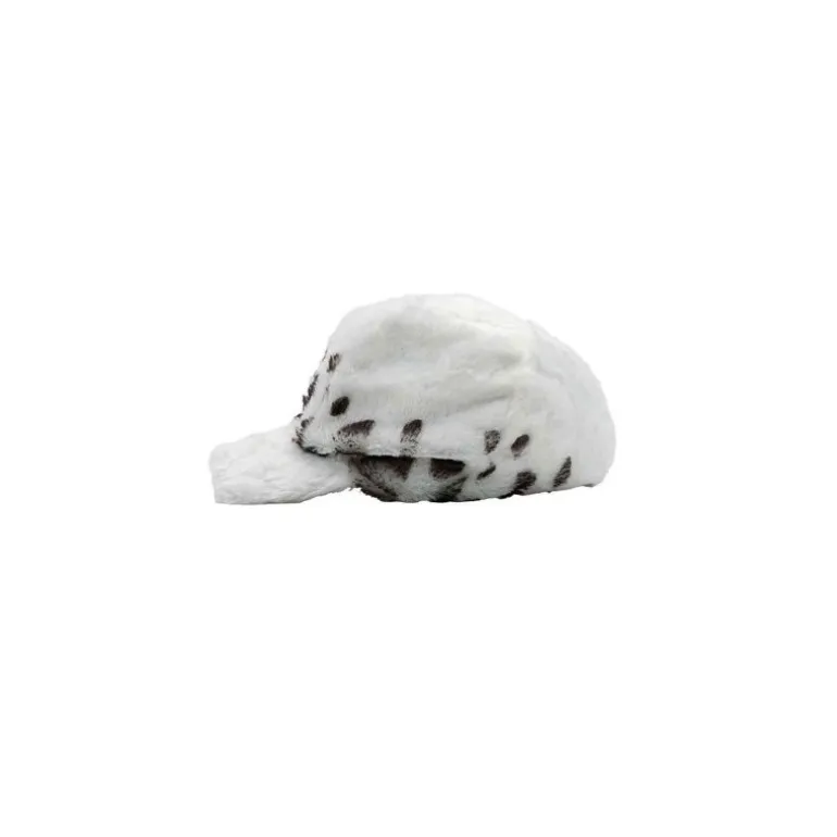 La gorra presenta un diseño inconfundible, con una base blanca adornada con manchas negras, replicando fielmente el estilo del personaje. Está elaborada en materiales de alta calidad que imitan el aspecto esponjoso y texturizado del sombrero original de Law.