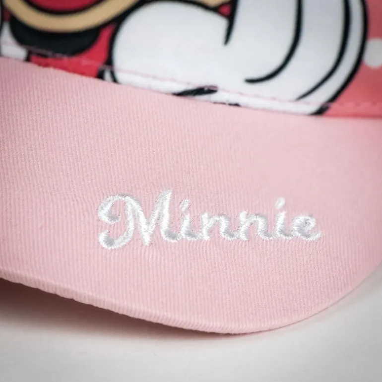 La parte frontal muestra una imagen vibrante de Minnie con un fondo de lunares blancos, realzando el atractivo del diseño. La visera también cuenta con el nombre «Minnie» bordado en hilo blanco, añadiendo un detalle extra de autenticidad.