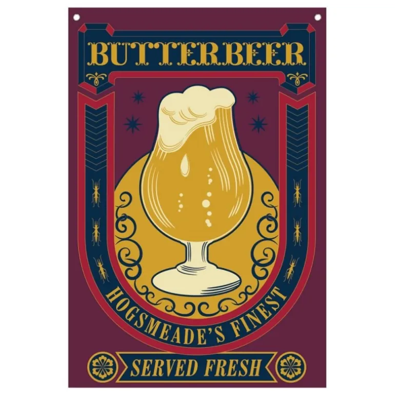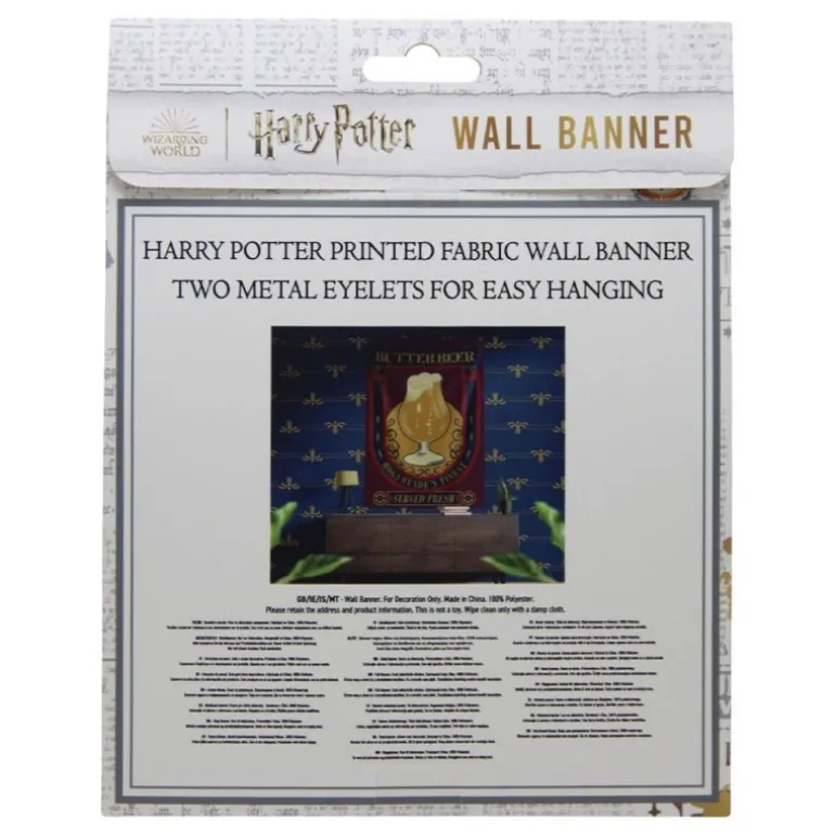 ¡Transforma tu espacio con la Bandera Butterbeer de Harry Potter! Con unas dimensiones de 125 x 85 cm, esta bandera es el complemento ideal para los fans del mundo mágico. Fabricada bajo licencia oficial por FaNaTtik, presenta un diseño vibrante que destaca un vaso de Butterbeer, la famosa bebida servida en Hogsmeade. Con tonos dorados y azules sobre un fondo burdeos, esta pieza de decoración es perfecta para colgar en cualquier pared gracias a sus ojales metálicos. Ideal para regalo o para darte un capricho, esta bandera de papelería combina calidad y pasión por el universo de Harry Potter.