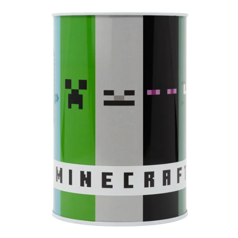 Una hucha genial cuyo diseño está dedicado al videojuego Minecraft, con varios elementos del juego sintetizados de una forma super elegante y colorida, uno representa un creeper,otro un enderman, otro una espada de diamante, otro un esqueleto…