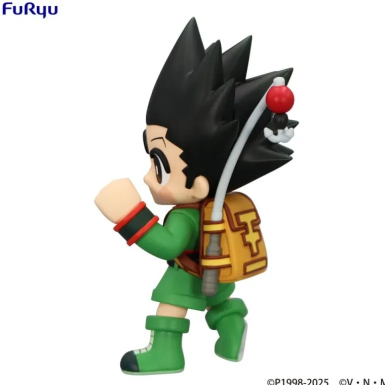 El diseño muestra a Gon en su icónico atuendo verde, con una expresión entusiasta y determinada que refleja su espíritu aventurero. La calidad del PVC asegura una durabilidad y detalles excepcionales, desde el pelo negro puntiagudo hasta sus características botas verdes. Gon lleva su mochila marrón clásica, completando así su aspecto característico.