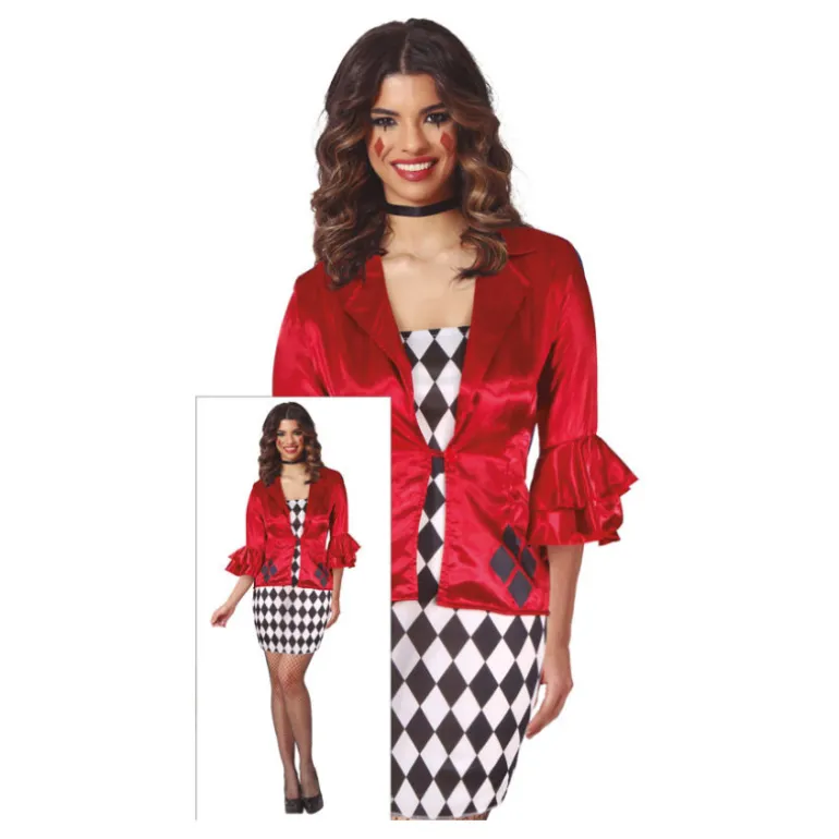 Transforma tu estilo con este disfraz de Harley Quinn roja para mujer, perfecto para deslumbrar en cualquier evento temático o fiesta de disfraces. Este conjunto incluye una chaqueta roja satinada con un elegante diseño de volantes en las mangas que añade un toque distintivo y audaz. El vestido adjunto presenta un patrón de rombos en blanco y negro, evocando el icónico estilo del personaje.