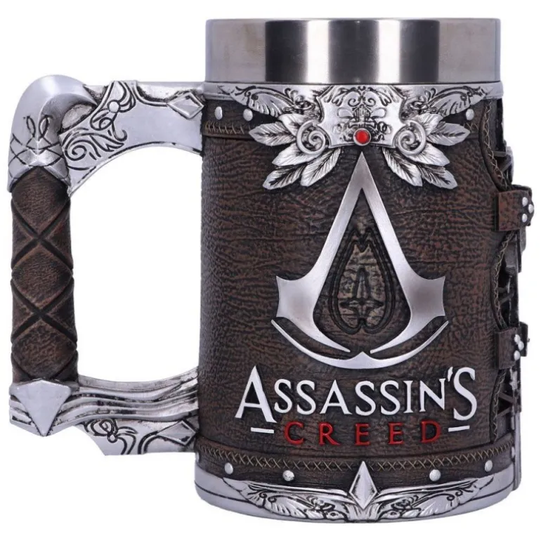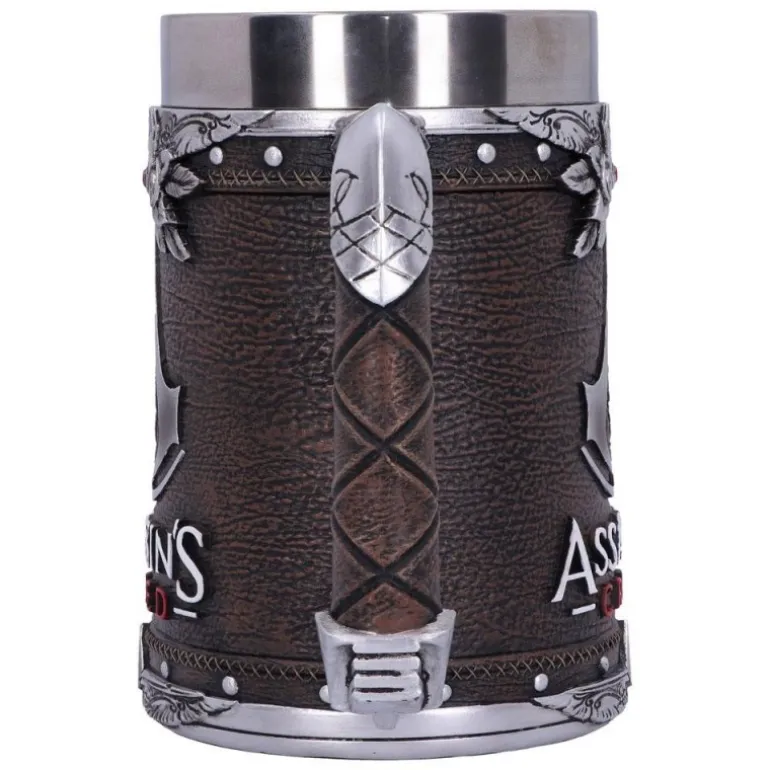 Descubre la Jarra Tankard de la Hermandad de Assassin’s Creed, una pieza única para los verdaderos admiradores de la saga. Este jarro pintado a mano se presenta con un diseño impresionante que muestra el emblema icónico de Assassin’s Creed en relieve plateado sobre una textura que simula cuero envejecido, transmitiendo un estilo medieval auténtico.