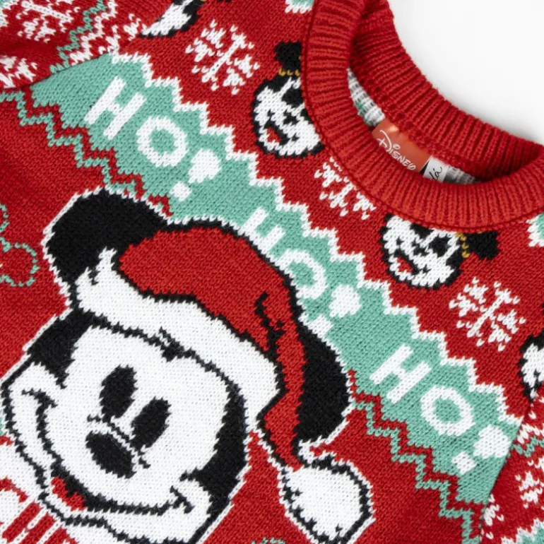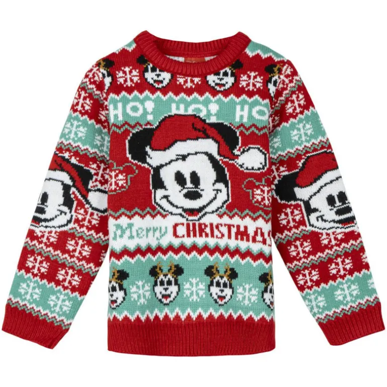 Este encantador jersey de punto navideño está diseñado especialmente para los más pequeños, con el icónico personaje de Mickey Mouse como protagonista. Fabricado en un vibrante color rojo, está adornado con motivos navideños que incluyen copos de nieve blancos y detalles en verde. La imagen de Mickey aparece con un gorro de Navidad, esbozando una sonrisa que encantará a los niños.