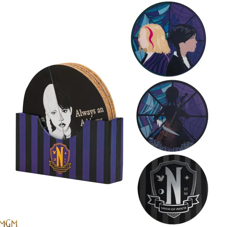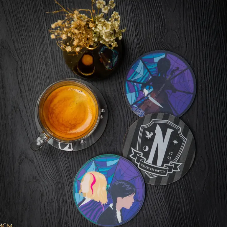 Cada posavaso está fabricado con materiales de alta durabilidad y resistencia, lo que garantiza su larga vida útil y su fácil limpieza. Además, su diseño cuidadosamente elaborado los convierte en una pieza de colección que cualquier fan de Miércoles Addams o de la Familia Addams en general querrá poseer.