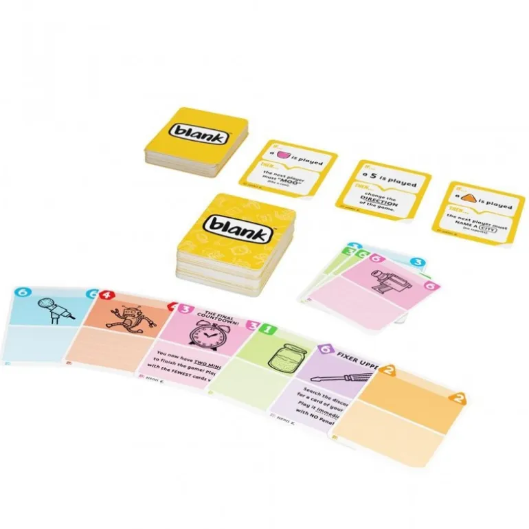 Descubre Blank, un juego de cartas interactivo donde cada partida es única. Ideal para jugadores a partir de 6 años, este juego permite personalizar reglas y efectos con cada victoria. El objetivo es ser el primero en deshacerse de todas las cartas, ¡pero cuidado con las cartas de Regla y los efectos de cartas de Juego que pueden cambiar el curso de la partida!