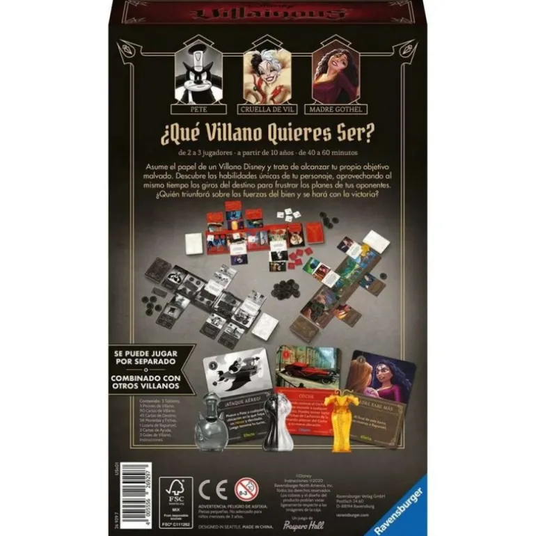 El set incluye figuras detalladas, cartas de villano, monedas y tableros, todos ilustrados con un estilo que captura la esencia de los personajes clásicos. Además, las Guías de Villano proporcionan estrategias y consejos para dominar el juego y lograr tus objetivos de una manera malvada pero astuta.
