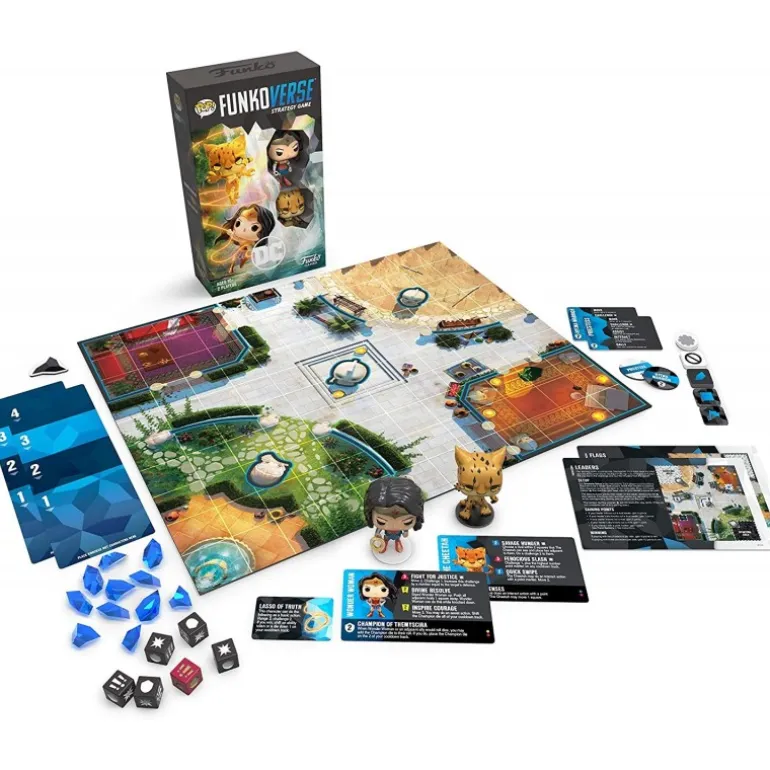 Incluye dos escenarios icónicos: Themyscira y Uzarri Jungle, que ofrecen una experiencia de juego diversa y emocionante. Las figuras Funko Pop! cuentan con cartas de reglas personalizadas y habilidades únicas, que los jugadores deben usar estratégicamente para obtener puntos y ganar la partida.