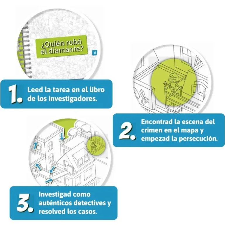 Transforma tu sala de estar en una oficina de detectives con MicroMacro Kids. Este juego de mesa interactivo invita a niños mayores de 6 años a desentrañar misterios ocultos en un mapa de 75×55 cm repleto de eventos intrigantes. Juega en equipo para resolver casos como el del ladrón de diamantes o el robot furioso. Incluye un libro de investigadores con 220 páginas y 22 casos, un libro de reglas y 20 fichas de detective. Diseñado para 1-4 jugadores, cada partida dura entre 15 y 45 minutos. Un regalo ideal para estimular el pensamiento crítico y la cooperación.