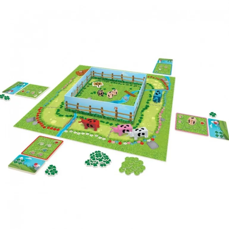 El paquete incluye figuritas de vacas en colores blanco y rosa con manchas negras, que aportan un estilo divertido y único al juego. Con capacidad para 2 a 4 jugadores y partidas de aproximadamente 20 minutos, es perfecto para mantener a los más pequeños entretenidos sin requerir un gran compromiso de tiempo.