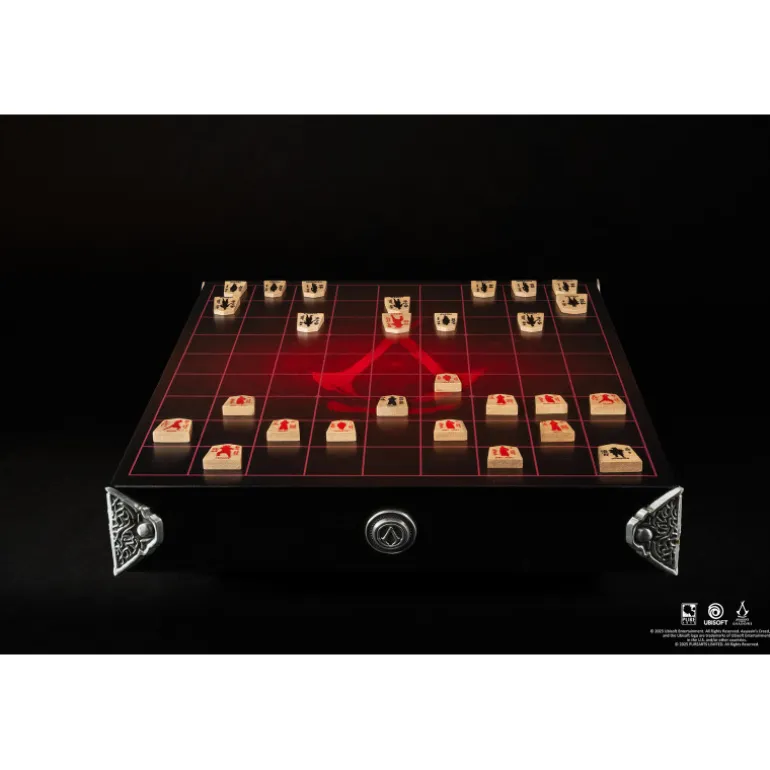 Descubre una fusión única de estrategia y cultura con el juego de mesa Shogi de Assassin’s Creed Shadows. Este impresionante tablero de madera, diseñado en tamaño estándar para torneos, está adornado con detalles metálicos esculpidos en las esquinas y el emblema de las Sombras de Assassin’s Creed en el centro. Las piezas de juego están hechas de elegante madera de bambú, cada una mostrando la silueta de un personaje icónico de la serie.