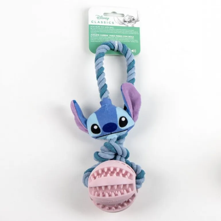 Este juguete para perro presenta una innovadora combinación entre una cuerda resistente y una figura lúdica de Stitch, el icónico personaje de Disney. Confeccionado en azul y rosa, el producto está diseñado para proporcionar horas de diversión interactiva a tu mascota. La cuerda trenzada es lo suficientemente robusta para soportar tirones y mordiscos, mientras que la figura de Stitch, hecha de material suave, añade un toque encantador. Además, la bola rosa texturizada ayuda a mantener la salud dental de tu perro, limpiando sus dientes mientras juega. Ideal para juegos de buscar y tirar.