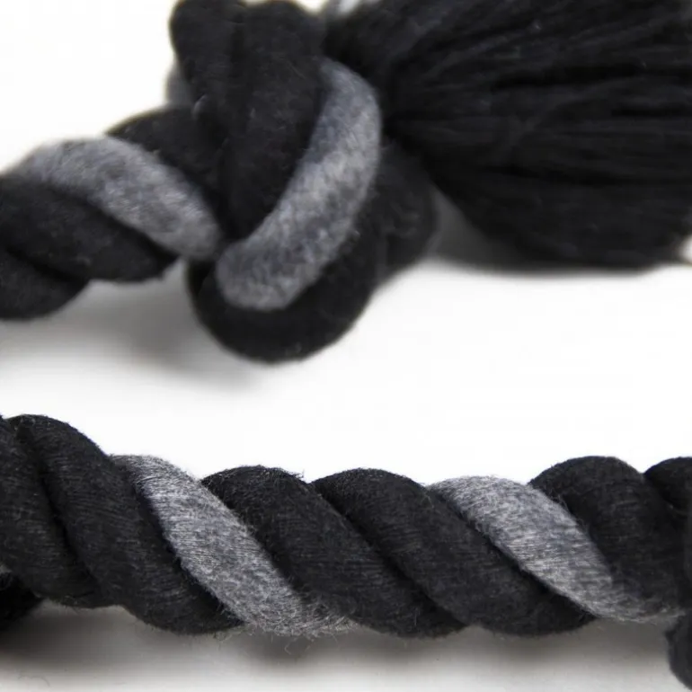 El cuerpo del juguete está hecho de cuerda trenzada negra y gris, ideal para juegos de tirar y morder, los cuales son perfectos para fortalecer la mandíbula de tu perro y asegurar horas de diversión. Las extremidades trenzadas culminan en nudos robustos que añaden resistencia y textura.