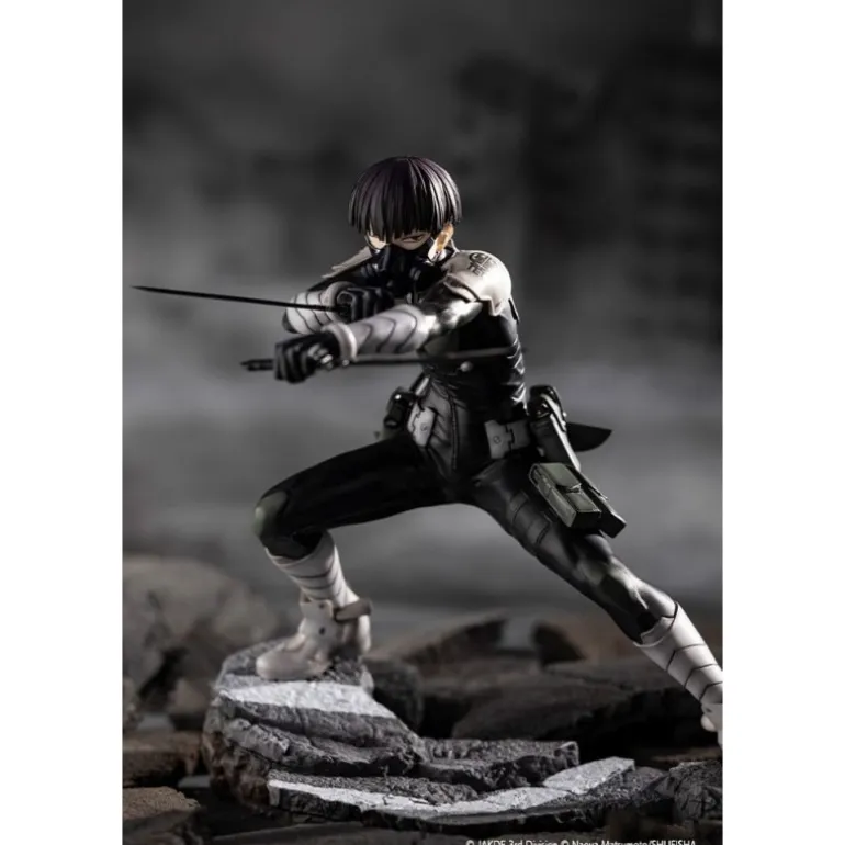 El diseño meticuloso resalta a Hoshina con su atuendo distintivo, combinando tonos oscuros con detalles en gris y blanco. La figura muestra el personaje preparado para el combate con dos katanas, destacando su determinación y habilidad. Fabricada por Kotobukiya, esta estatua de PVC destaca por su calidad y realismo, desde las texturas de la ropa hasta la base que simula terreno pedregoso.
