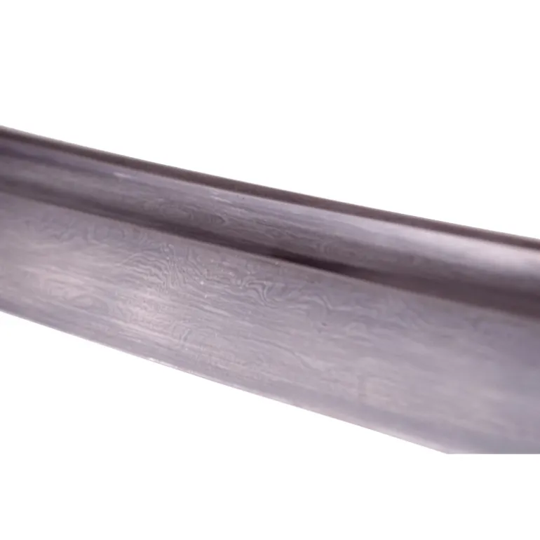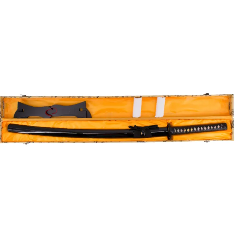 Mide un total de 103.5 cm y esta fabricada acero. Tiene hoja de acero de damasco AISI 1045 con filo, un grosor de 7,5 mm, con vaina color negro y encordado negro, mango con encordado negro, con soporte y caja de madera forrada de tejido decorativo de presentación. Fíjate bien en las fotos para ver más detalles que tienen la hoja, la caja y la funda.