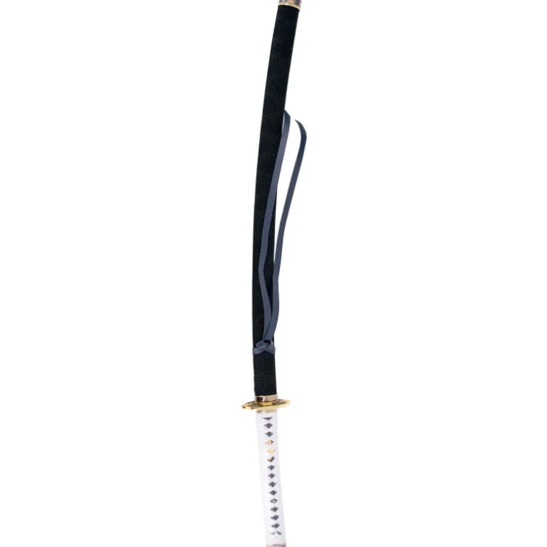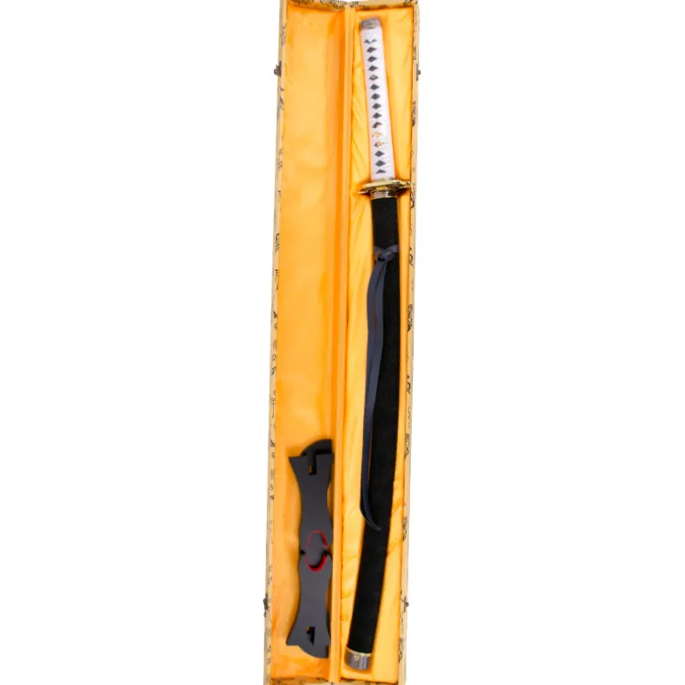 Además, viene acompañada de una vaina de madera forrada con piel negra y un mango encordado blanco, lo que le otorga un aspecto elegante y auténtico. Esta katana se presenta en una caja de colección y viene con un soporte para que pueda ser exhibida en cualquier lugar de forma segura y elegante.