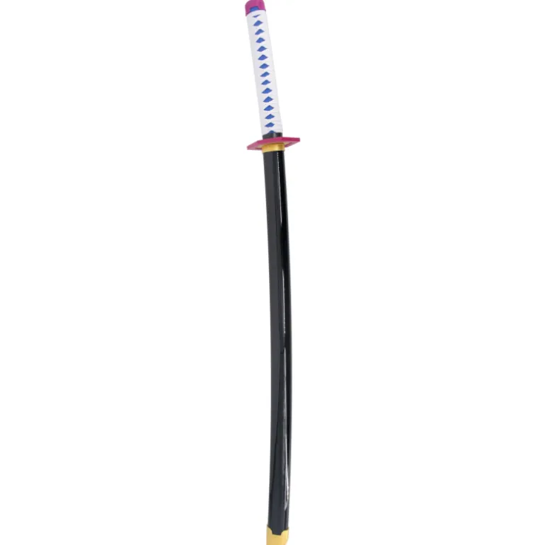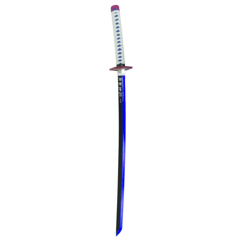 Es una réplica de la espada Mingshao que lleva Tomioka Giyuu durante los episodios que mide un total de 101cm y con la hoja de bambú, mango con encordado blanco sobre piel imitación raya color azul, vaina negra con detalles en morado.